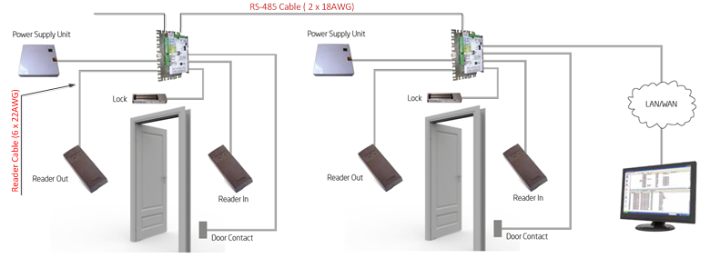 Cáp dùng để kết nối đầu đọc thẻ (Reader) vào bộ điều khiển (controller) thường là cáp 3 Pairs hoặc 4 Pairs, có tiết diện 22 AWG (American Wire Gause) trở lên (Lõi dẫn bằng đồng tráng thiết và cách điện bằng nhựa PE), xoắn đôi từng cặp, có chống nhiều bằng màng nhôm (Al) kết hợp dây thoát nhiễu.
